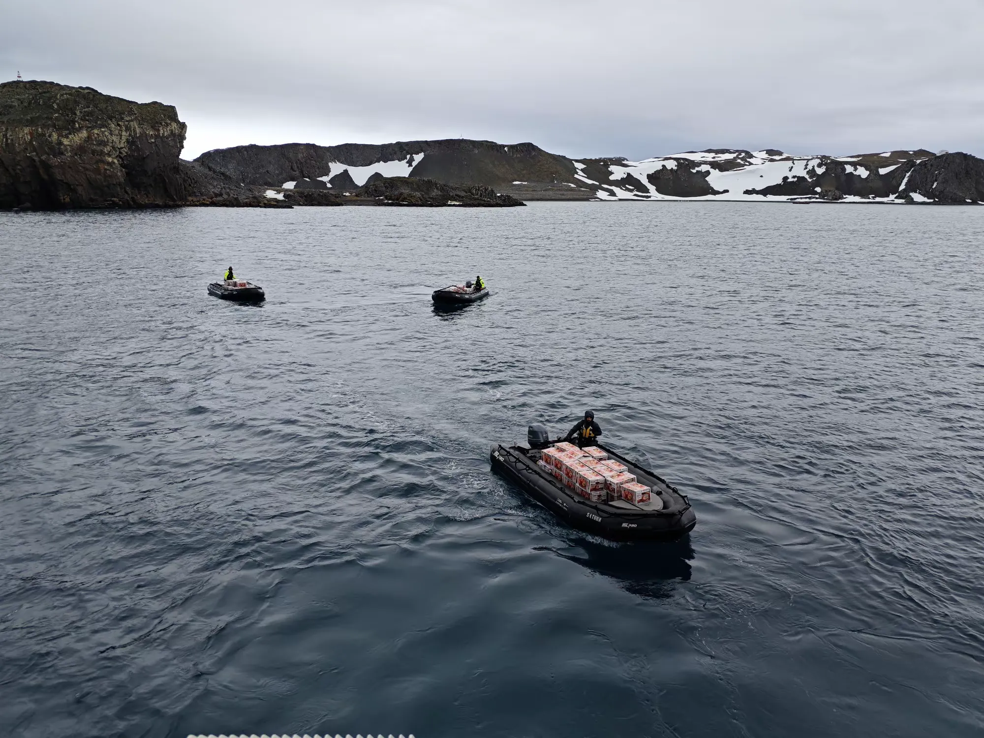 这些冲锋舟,还兼做运货船。船上装的,是从岛上运到邮轮上的补给,是我们以后几天的“口粮”。
