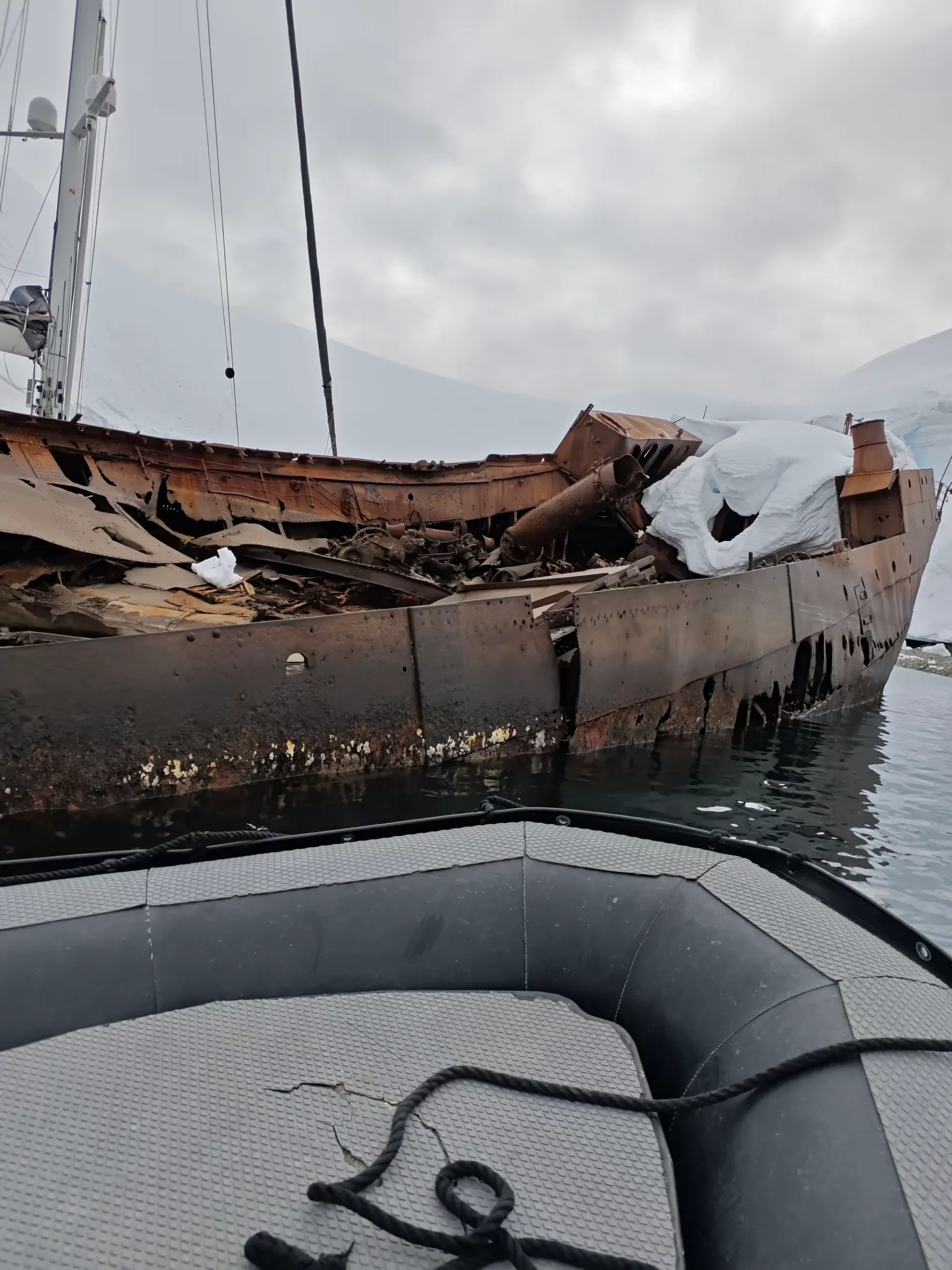 这里是企业岛。海滩上搁浅的,是挪威一艘捕鲸船的残骸。100多年前,约1915年,该船在海湾避风时起火,船上载有大量鲸油。油助火势,以致不可收拾。