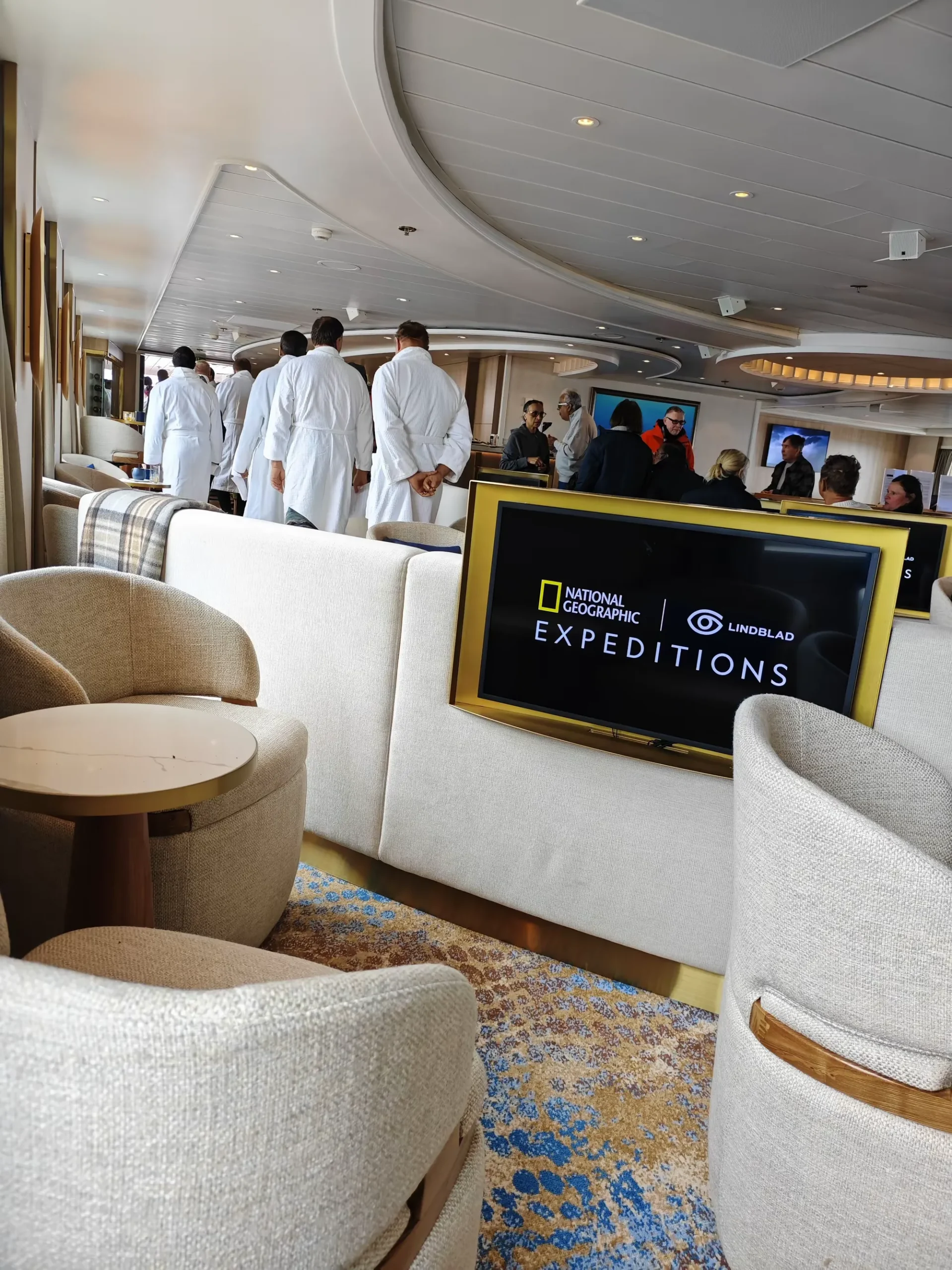 回到船上,在休息室小坐,喝杯咖啡。但见一排游客穿着白色的浴袍,从休息室走向船尾。