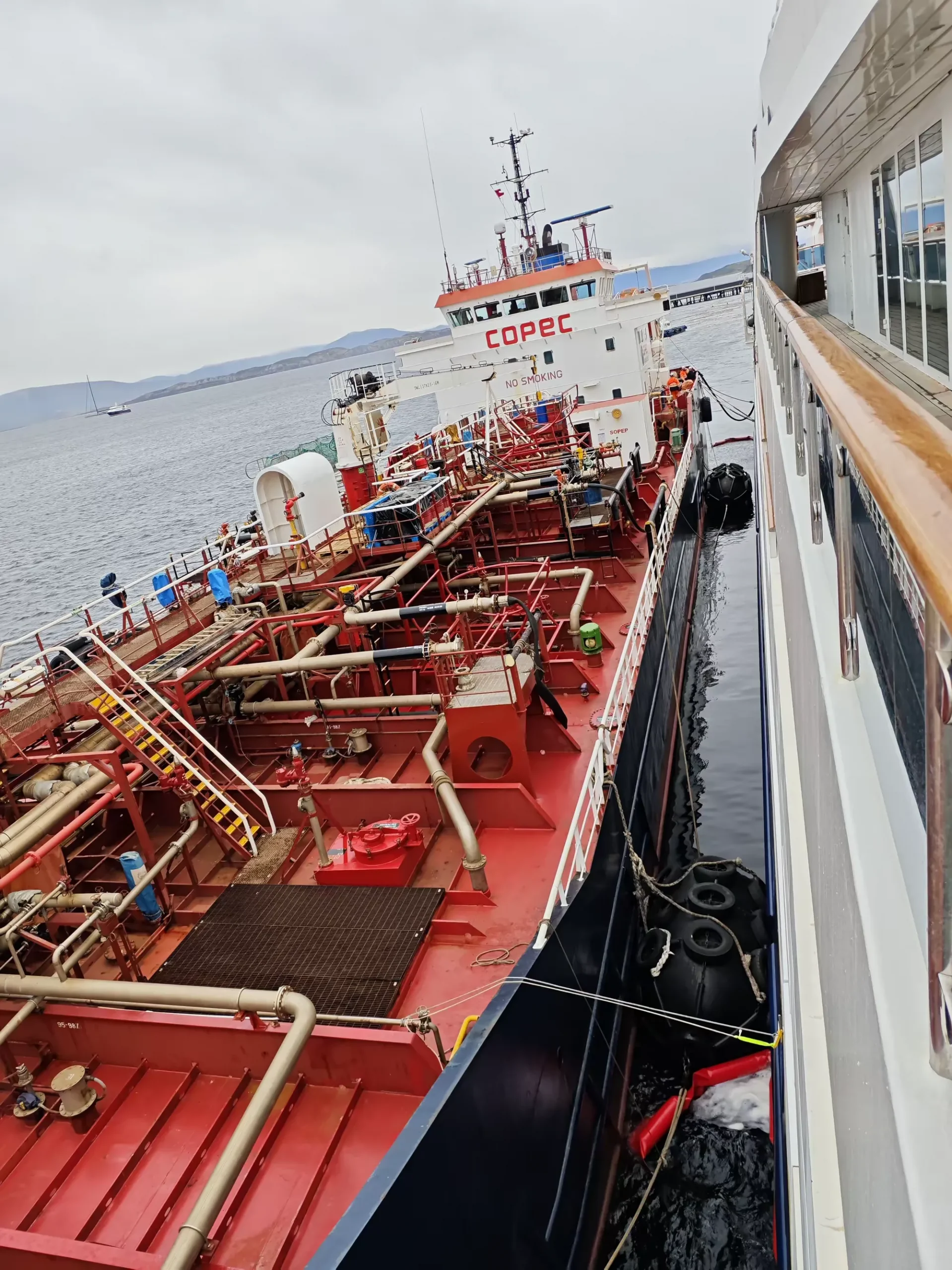 船的另一边,在给邮轮加油。全速开了两天两夜,得补补。