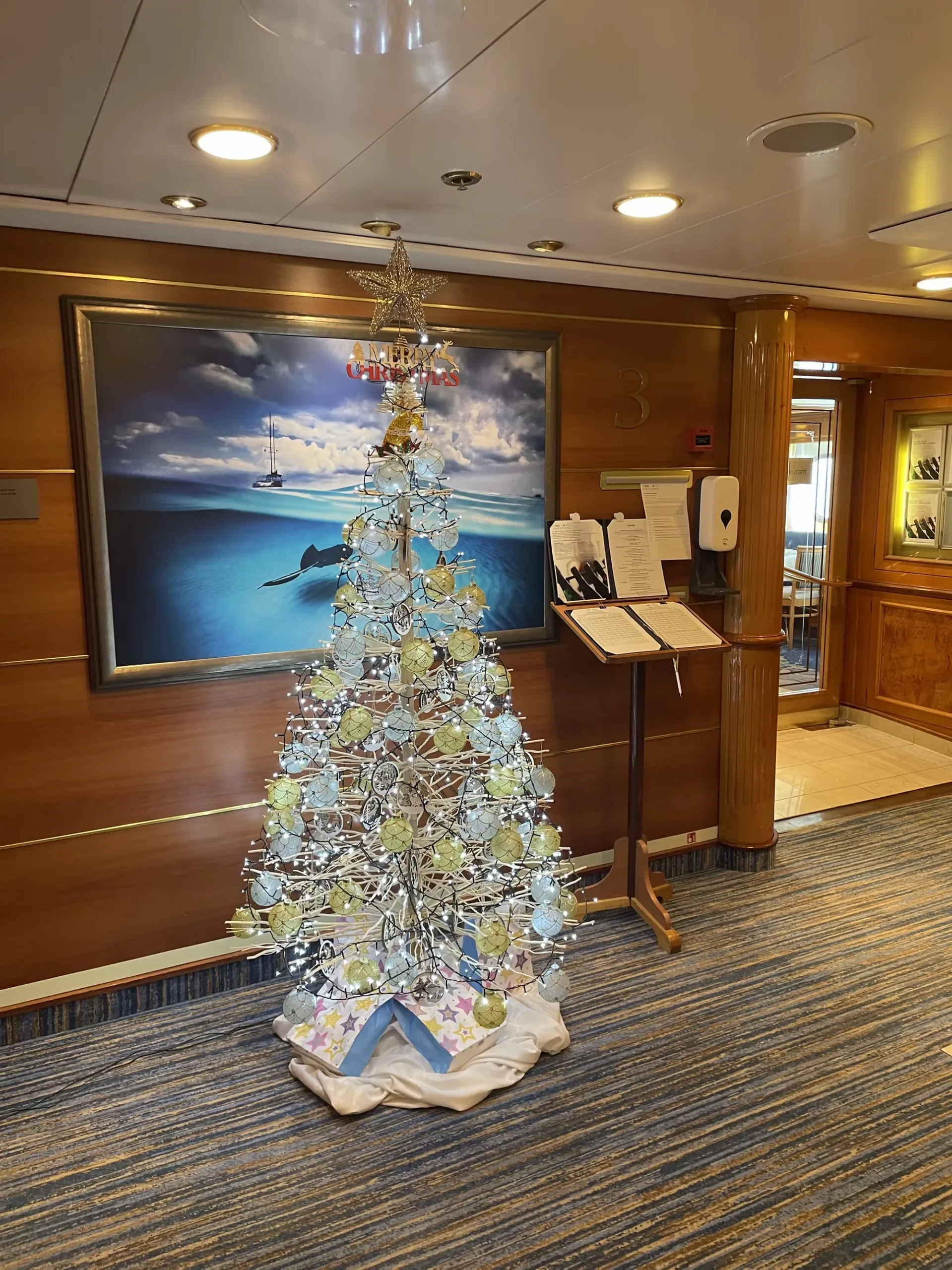 尽管离圣诞节还有十几天,但邮轮的餐厅门口已经布置好了圣诞树,营造起节日的气氛;也让我们焦急等待的心稍事安定。